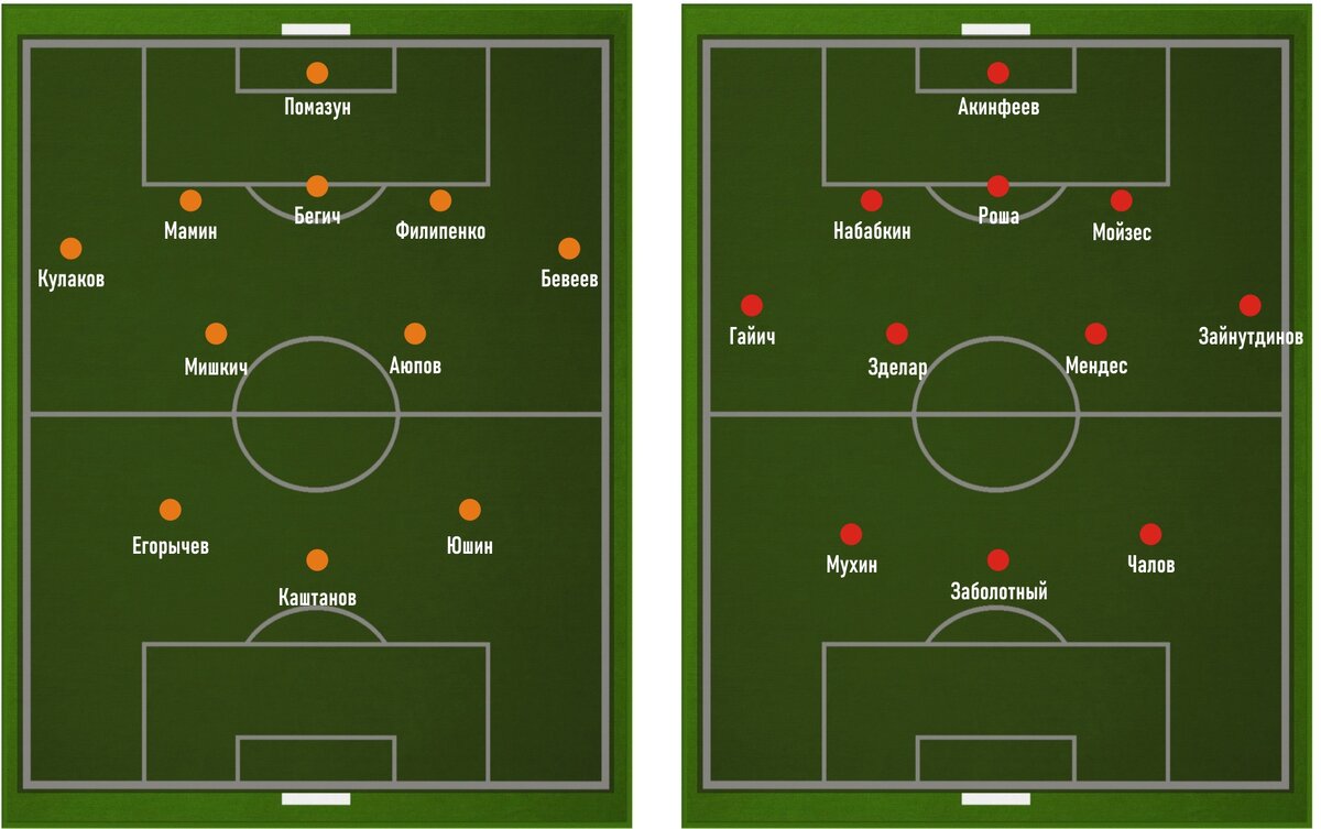 «Урал» и ЦСКА начали игру с одинаковой схемой 5-3-2. Конечно, позиции не абсолютно идентичны. Фланги ЦСКА больше играют в атаку, ибо умеют, потому крайние нападающие играют ближе к центральному. Изменения по ходу игры Во втором тайме у «Урала» вместо Кулакова вышел Кики и занял левый фланг, Бевеев переместился на «родной» правый. Егорычев после выхода Ишкова на 89 мин. перешёл на позицию центрального полузащитника. У ЦСКА травмировался Роша и вместо него на 32 мин. вышел Рядно. Мойзес сметился в центр, Зайнутдинов сместился на позицию левого центрального защитника, а Рядно стал играть слева. Увидев, что Рядно на фланге совсем никакой, после перерыва он поменялся местами с Зайнутдиновым, который таким образом вернулся на фланг. Игра Первый голевой момент. Расстановка «Урала» 5-3-2 даёт пространство Мендесу. Мойзес подключился к атаке, но Мишкич не спешит защищаться. Каштанов не может разобраться, с кем ему играть и доигрывать ли по Мендесу. Мойзес получает мяч, свободный Мендес готов ра
