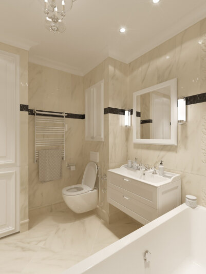 Я уже писала про свою ванную и про то, что я хочу сделать в ней ремонт: Мне не нравится плитка в ней, такой размер, цвет и укладка давно не актуальны, мебель и сантехника мне достались от прежних владельцев квартиры и это все уже порядком изношено. Отмывай не отмывай - новым не станет. Шкафчик разбух после потопа, зеркало начало темнеть, а это очень плохая примета, у ванны отлетел и деформировался экран, его закрепили на саморезах, но все равно - есть заметная щель между экраном и чашей. Поэтому необходимость ремонта назрела давно. Поскольку бюджет у меня ограничен, я ремонт делаю по шагам. Например, два года назад я делала кухню. Если интересно, могу сделать ее обзор) Также хочу в прихожей заменить ламинат на плитку. Ламинат тоже изменился не в лучшую сторону после затопления, поэтому будет вполне логичным его заменить. Я хочу что-то такого плана: Современная классика в светло-бежевых тонах и такую же плитку положить в прихожей Я выбирала из вариантов, которые предлагаются в Оеру