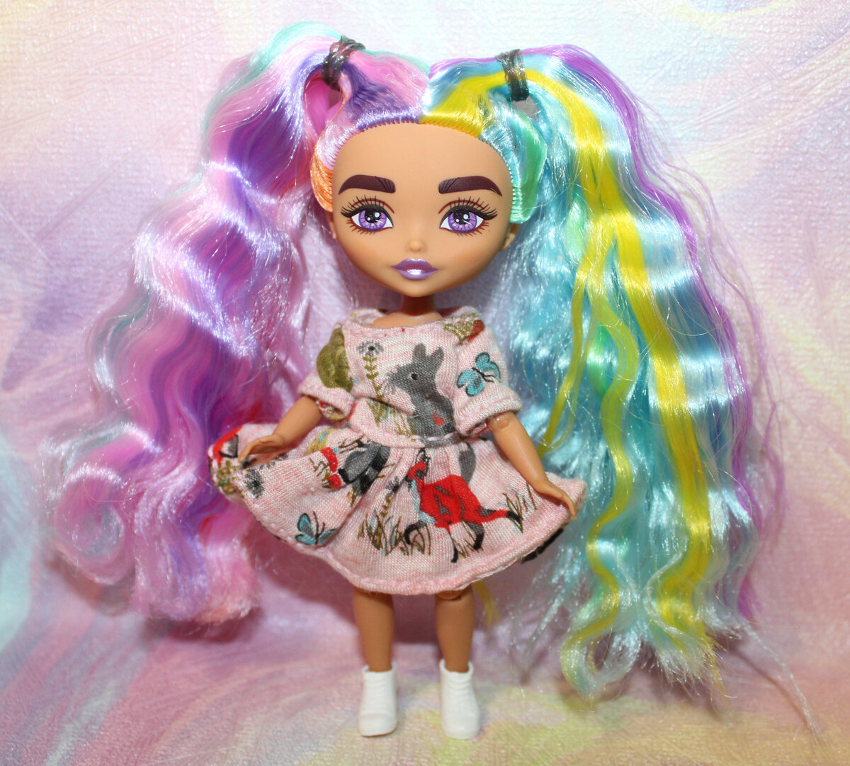 Конечно, новую куколку хочется сразу переодеть. А во что? Померила на неё маленькие платьица от других кукол. Самопошив (не мой) на Еви, малышку от Штеффи. Костюмчик от Boxy Girl Платье от Медди Ever After High (подростковое тело). Блузка от стандартной Monster high смотрится вполне как платье. Если не путаю, то это платье от Winx Костюмчик от Snapstars Тоже от Monster High, но не помню точно, от кого. И это платье не помню чье. Либо Winx, либо Equestria Girls Официальный фешн пак для младшей сестренки Likka от Такаратоми. К сожалению, велик в обхвате. Платье и пояс от Pixy оленя Ever After High Как видите, подобрать что-то можно, но сложно и сидит не идеально. С обувью всё ещё хуже. Тапочки от малышек типа Еви безобразно велики. Более-менее садятся туфли от Enchantimals (розовые) и поддельных тонконогих феечек (черные). Но стоять сама в них кукла почти не может, тк её ножки плоские, а у этой обуви есть подъём. Тапочки от Еви ей очень велики, от пижамных мини принцесс малы... Вся барб