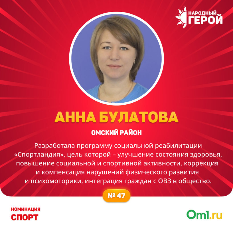 В Омской области определены победители в территориальных зонах — Север, Юг, Запад, Восток и Центр. До 20 августа продлится финальный этап голосования за номинантов. Ранее мы рассказывали про финалистов двух номинаций — «Патриотизм» и «Интеллект». На очереди — пять победителей номинации «Спорт». Читайте о заслугах этих людей. Анна Булатова (Омский район) Александр Мамонтов (Седельниковский район) Андрей Шмидт (Исилькульский район) Талгат Курмашев (Нововаршавский район) Степан Юзденский (Омск) Читайте также на портале Om1.ru Рассказываем о пяти финалистах премии «Народный герой — 2023» в номинации «Интеллект»