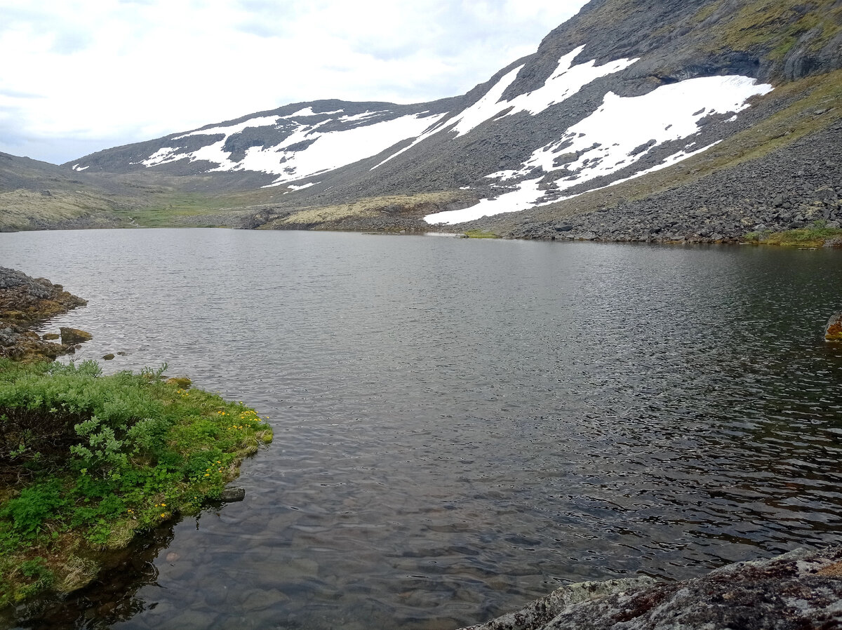 Но пора уже становиться на ночлег. Оставив рюкзаки на камнях, бежим в радиалку ко второму Горному озеру (по крайней мере, так оно обозначено на Викимапии), у подножия горы Пялкинпорр. С его западного берега снова можно полюбоваться далями. А потом - по курумам к рюкзакам и последний маршбросок. У рюкзаков скачет по курумам самец белой куропатки, и, завидев нас, поднимается на крыло. До пары Светлых озер у подножья горы Сэлсурт уже рукой подать. Место удивительное: на нашем берегу чистая ровная площадка, хорошо подходящая для ночлега. На другом - ослепительный большой снежник, сбегающий со склона горы прямо к воде. За россыпями курумов - еще одно озерцо. И северное ясное небо над головой.