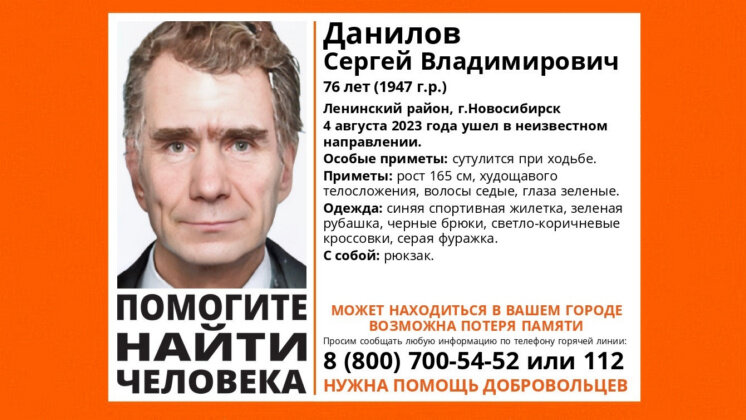 В Ленинском районе Новосибирска без вести пропал 76-летний Сергей Данилов. Как сообщили в поисково-спасательном отряде (ПСО) «ЛизаАлерт», с 4 августа 2023 года его местонахождение неизвестно, мужчина ушел в неизвестном направлении. Приметы пропавшего: рост 165 сантиметров, худощавое телосложение. Волосы седые, глаза зеленые. При исчезновении был одет в синюю спортивную жилетку, зеленую рубашку, черные брюки, светло-коричневые кроссовки и серую фуражку. С собой у пенсионера был рюкзак. Волонтеры отметили, что при ходьбе сибиряк сутулится, возможна потеря памяти. Если у вас есть информация о местонахождении Сергея Данилова, сообщите об этом по телефону ПСО 8-800-700-54-52 или наберите 112. Ранее «Вести Новосибирск» писали, что в областном центре без вести пропала 12-летняя девочка с розовыми волосами.