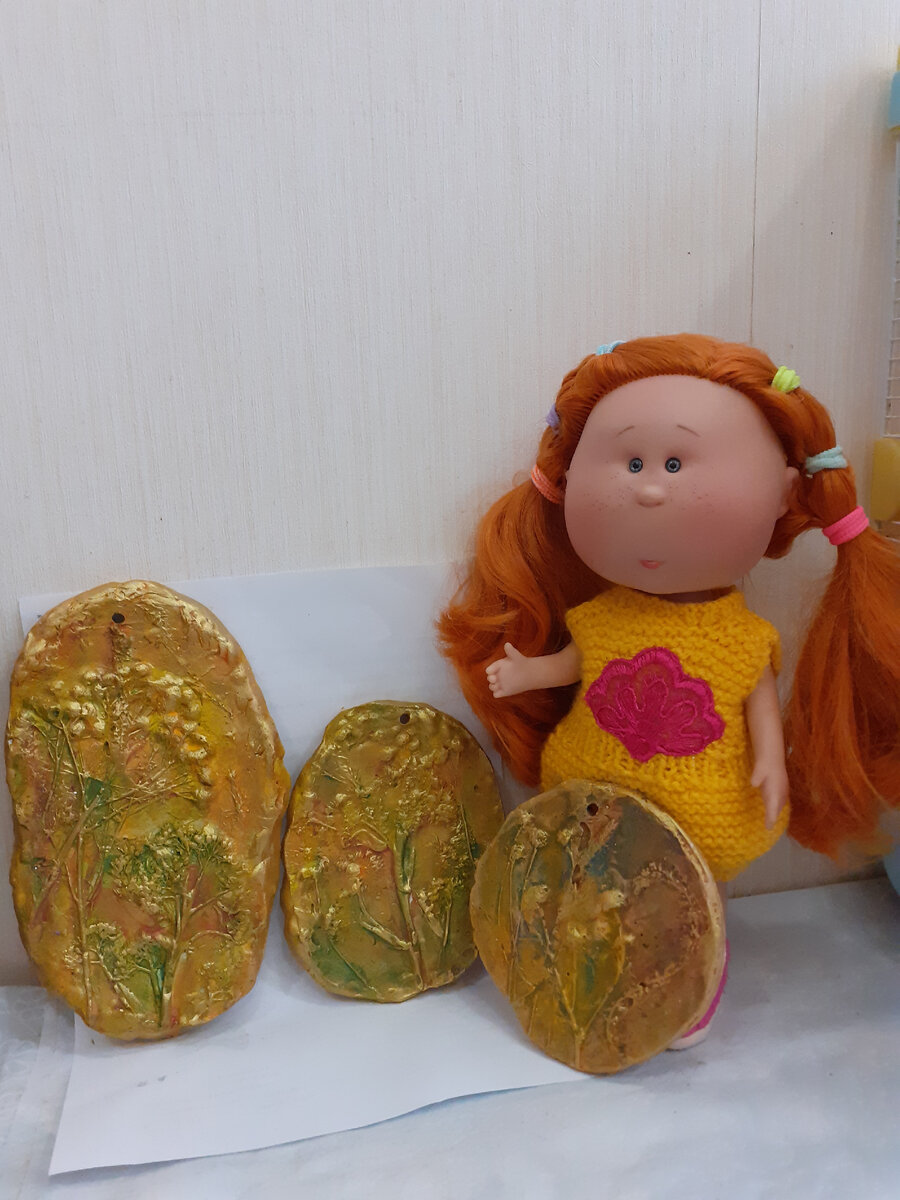 Здравствуйте! Вместе с Марусей займемся интересным делом - созданием объемных оттисков растений на гипсовой плоскости, то есть созданием ботанического барельефа. Берем пластилин, разминаем его. Скалкой раскатываем пласт нужных размеров. Заранее подготовили траву и цветы, с которыми будем работать. Выкладываем нужные растения на пластилин и прокатываем скалкой, чтоб отпечатался рисунок. Затем аккуратно извлекаем эти растения из пластилина. Мелкие части растения достаем при помощи пинцета. Создаем бортики по периметру отпечатка. Подготовим гипс для заливки, засыпая сухой гипс в емкость с водой, постоянно перемешивая. Время застывания гипса очень маленькое, поэтому работаем оперативно. Не забываем вставлять коктейльную трубочку перед заливкой, чтобы сформировать отверстие для подвешивания работы. Гипс затвердел, убираем из пластилиновой основы. Заготовка барельефа получилась, осталось ее доработать, убрав лишние неровности с боков и задней стороны (ножом или наждачной
