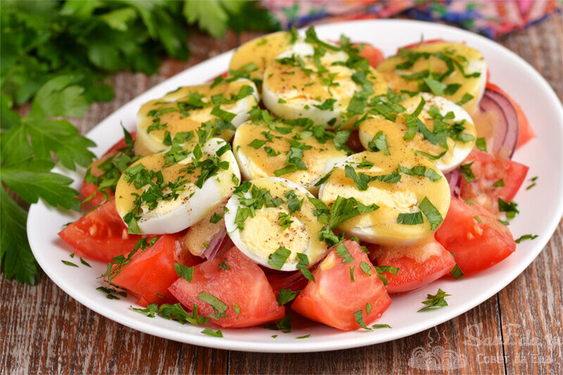 Быстрый салат из помидоров и яиц (отличная заправка из 2 ингредиентов)