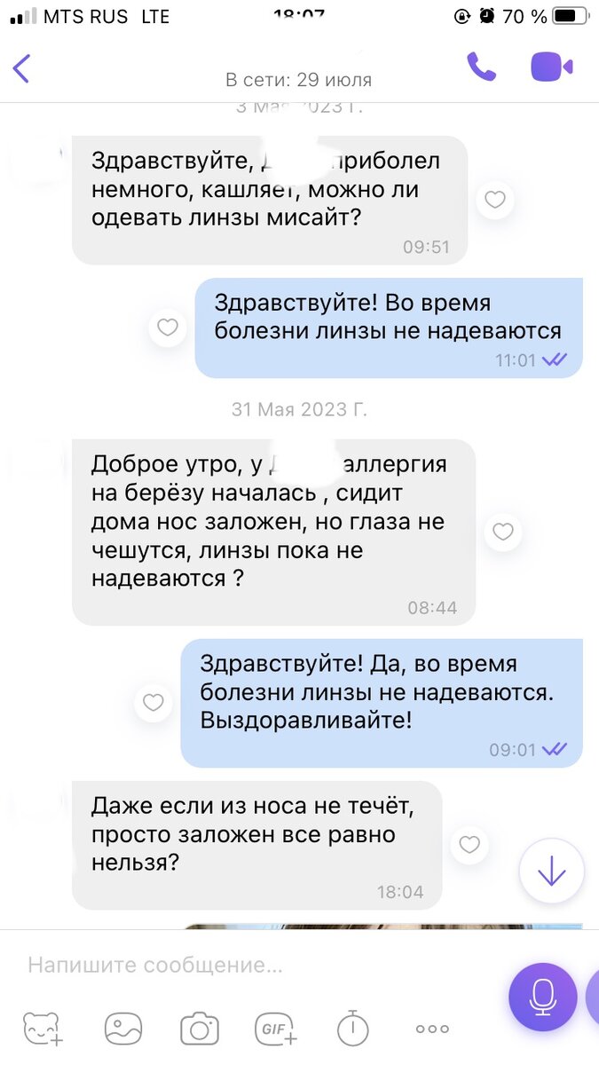 Сегодня пришли пациенты, которые меня раздражают. Ну вот так бывает. Конечно, я не показываю виду, провожу приёмы согласно протоколу, консультирую и веду себя как обычно. И только своим читателям могу рассказать о сокровенном. Итак, что происходит за пределами кабинета, когда я дома и занимаюсь своими личными делами … Начну с того, что при ношении контактных линз важно соблюдать осторожность, не пользоваться ими при заболеваниях, простудах, конъюнктивитах, аллергических реакциях и т.д Все эти правила я обязательно рассказываю пациентам, и данные пациенты не были исключением. Теперь вставляю скрин из переписки: Как видно, пациенты обратились 3 мая, затем 31 мая. Апрель-май - сезон аллергии на цветение берёзы. Я это прекрасно наблюдаю у своей дочери: каждый год у неё всё плохо; в прошлом году даже вызывала скорую помощь: после прогулки конъюнктива отекла и вылезла из орбиты, глазной щели практически не было, сплошное мясо. И вот при таких данных пациенты начинают меня дёргать, можно ли в