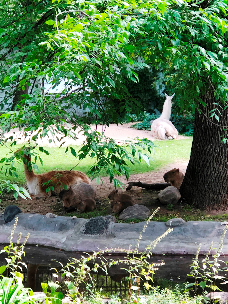 Впечатления положительные. Даже ещё до посещения: можно легко купить билет онлайн и не стоять в очереди. Причём дети бесплатные :), а билет для взрослого стоит 1 тысячу рублей. Получается, я вдвоём с детьми прохожу в зоопарк за тысячу рублей, что, в принципе, не дорого. На территории зоопарка не жарко благодаря водоёмам с большими деревьями и "поливалкам" (куда с радостью влезают дети :)). Много фонтанчиков с питьевой водой. Зоопарк большой, так что надо рассчитывать свои силы :). Однако имеется много скамеек и кафе; мест для отдыха хватает всем. Есть ещё несколько детских площадок и аттракционы. Многие вольеры расширяют, и это радует. Обитатели зоопарка ухоженные, а воняет только у фламинго, но это какое-то их личное болото, и оно, по ходу, в жару зацвело и слегка протухло :( (раньше вроде такого не было). Мы приехали туда, в первую очередь, ради детёнышей капибар. Очень милые :). Правда, они часто гуляют вдалеке от заграждений, а места там много, поэтому не всегда удобно их фотогра
