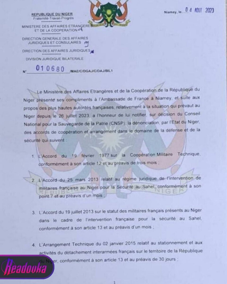 На территории страны находится более 15 тысяч иностранных солдат. Сегодня, 6 августа, в сети распространяется документ, который, опубликовало временное военное руководство Нигера. Как сообщают местные СМИ, согласно преписанию у Франции есть 30 дней на то, чтобы покинуть территорию африканской страны. На данный момент там находится более 15 тысяч французских граждан. Причиной такого решения стала денонсация соглашения о Сотрудничестве в области безопасности и обороны с Парижем действующее с 1977 года. Сейчас в Нигере дислоцированы 15 тыс французских военнослужащих, и все они должны покинуть территорию африканской страны. Напомним, ранее французское правительство заявило о том, что не станет признавать решение Военного совета Нигера по отмене военных соглашений. Делегация ЭКОВАС заявила о плане вторжения в Нигер. На эти сообщения незамедлительно отреагировали в Ниамее и заявили, что агрессия со стороны сообщества профранцузских стран Западной Африки будет наказуема. Также новое правитель