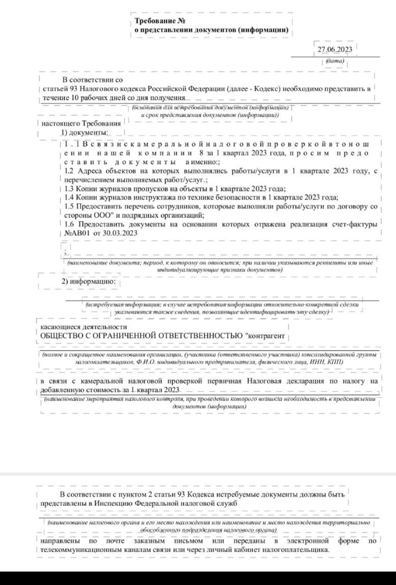 Первое, что сидит в голове у любого специалиста относительно камеральных проверок - это то, что у налогового органа в рамках таких проверок отсутствует право истребования документов. В качестве исключений, когда права запросить подтверждающие документы у инспекции всё же есть, все обычно вспоминают 2 случая: декларация по НДС к возмещению и заявление вычетов по НДФЛ. Между тем, даже если декларация по НДС к уплате, то в рамках неё налоговый орган также наделен некоторыми дополнительными правами в части истребования документов. На фото представлено реальное требование в рамках камеральной проверки по НДС, присланное участником нашего последнего мастер-класса "Камеральная проверка: прохождение". Давайте на его примере разберем всё самое важное, что требуется для правильного реагирования на такие требования. 1. Есть в статье 88 НК РФ, регулирующей камеральные проверки, хитрый пункт 8.1, на который многие наверняка не обращали внимания. Этот пункт даёт налоговым органам право истребо