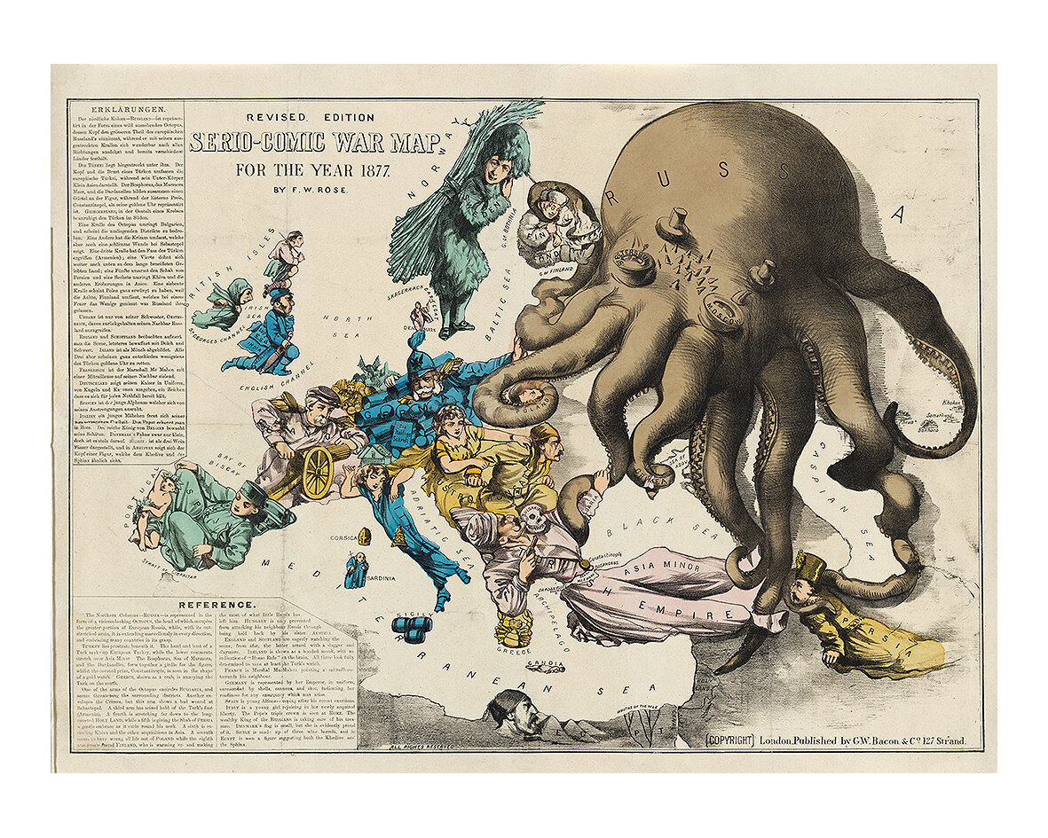 Её долгий звездный час начинается в 1877 году, когда будет опубликована «Осьминожья карта» британского карикатуриста Фредерика Роуза, её вы наверняка хоть раз да видели. Здесь осьминогом снова становится Россия. Глаза её бездушные и мутные – Петербург и Москва, щупальца оглаживают континентальный фронтир и тянутся к Турции.