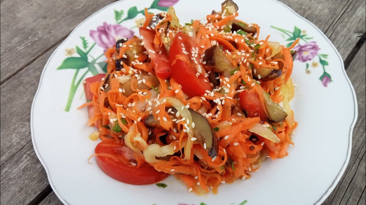 В первую очередь нарезанные баклажаны засыпаем солью (1 ст. л.) и заливаем водой (500 мл.), даем постоять баклажанам 10 - 15 минут чтобы из них вышла горечь. В течении данного времени баклажаны пару раз можно перемешать. Хорошо разогреваем растительное масло, пока оно разогревается в пустую чашу отправляем: морковь, болгарский перец, измельченный чеснок, сахар, соль, перемешиваем. Теперь аккуратно переливаем раскаленное масло в чашу с морковью и болгарским перцем, перемешиваем. Добавляем уксус и еще раз перемешиваем. Оставляем морковь мариноваться.