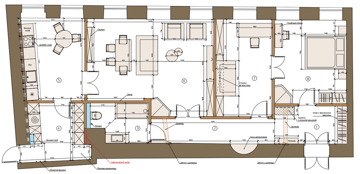 В итоге рассматривали несколько вариантов. 1. Сделать много комнат, просто оставить то что есть. Но хочется и большую гостиную да и смысл делать скворечники. Поэтому соединили маленькую комнату у кухни с большой и получили гостиную-столовую Спален получилось две, одна это кабинет но трансформирующийся в спальню а может и просто спальня, это сложный вопрос, затем столовая-гостиная и большая кухня с обеденной зоной. В квартире нет ванной, но удачно вписали все в огромный коридор. Задний вход превратили в огромный хоз блок с кладовкой, постирочной и гардеробом. В общем смотрим, делимся идеями Печки сохраняем, ремонтируем, и топим дровами зимними вечерами