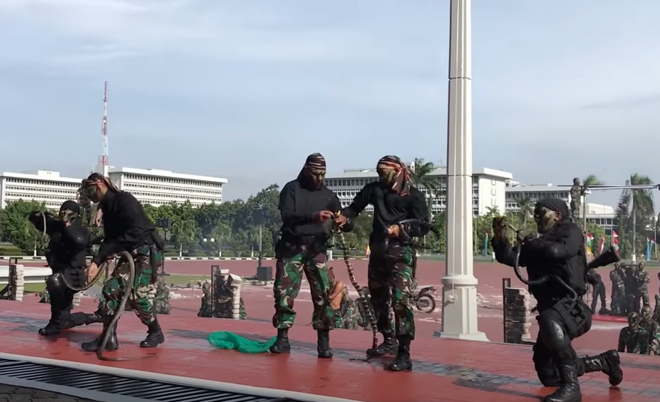Каждое войско хочет показать свою доблесть и славу. У какой-то страны есть танец воинов, у другой – показательные забеги. А Индонезийцы выбрали такой вариант поразить соперника, что тот запоминается навсегда. Индонезийцы кусают змей первыми! На показательных выступлениях специальный отряд (что-то вроде спецназа) кусают ядовитых змей, открывают от них зубами куски и едят. А потом еще запивают змеиной кровью. Так солдат показывает, что способен выжить абсолютно везде. Даже в диких джунглях, не просто не испугаться живности, но и сделать ее своим пропитанием. Зрелище и правда внушает холодящий страх. Сначала солдаты высыпают ядовитых змей из мешков прямо на асфальт. Те живые и шевелятся, а солдаты без страха быть укушенными ловко их хватают и фиксируют. Вторым номером в программе стало кручение на шее живых змей. Тренировки не прошли даром, пострадавших на показательных выступлениях не было. Хотя не сомневаюсь, что во время тренировок без больницы и реанимации не обошлось. Хотя говорят, ч