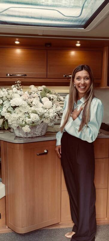 Тодоренко участвует в съемках проекта, название которого пока держится в секрете. Топалов нашел возможно порадовать возлюбленную на площадке. Неожиданным сюрпризом артистка поделилась в социальных сетях. «Только он мог прислать мне такую корзину цветов на съемочную площадку — мой МУЖ! Так неожиданно и так приятно! люблю!», - написала Тодоренко в своем Telegram-канале. Запись артистка сопроводила фотографиями с букетом. В актерском вагончике Тодоренко. На снимке теледива позирует в черных брюках и шелковой блузке бирюзового цвета. Артистка призналась, что была поражена сюрпризом от возлюбленного. Напомним, Регина призналась, что во время отпуска сильно поправилась. Отдых семьи был омрачен травмой головы у младшего сына супругов.