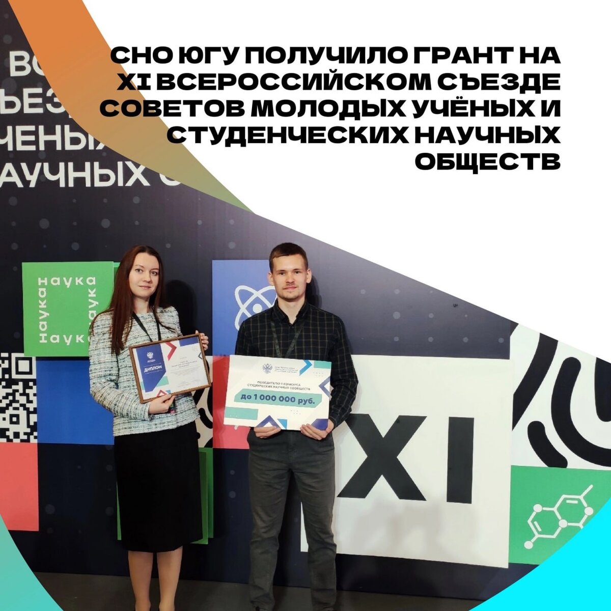 СНО ЮГУ получило миллионный сертификат на развитие научного направления в университете. Документ от Минобрнауки вручили председателю СНО ЮГУ Алексею Кокорину и доценту Высшей школы цифровой экономики Анастасии Устюжанцевой на XI Всероссийском съезде Советов молодых учёных и студенческих научных обществ.