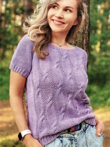 Лето перевалило таки за свой пик и неумолимо приближается осень. Потому ажурная рубашка поло, на перевод описания которой я настраивалась два дня, уступила место футболке с "косами". Её плюс в том, что после небольших манипуляций на базе описания этой модели можно получить тёплый джемпер для холодного времени года, которое не за горами 😉. Модель создана российским мастером, её описание опубликовано в российском журнале. Как приятно об этом писать!..😉🌷 Футболка с "косами" от Ольги Макшеевой Как выглядит Замечательный летний джемпер с рукавом реглан связан сверху вниз одним полотном, без швов. Планка горловины и низа, а также манжеты рукавов выполнены фантазийной резинкой. Узор с "косами" выполнен и спереди, и по спинке. Размеры Есть расчёты для размеров XS(S-M)L Материалы Вам потребуется: пряжа Loro Piana COTTON-SILK (80% хлопок, 20% шелк,