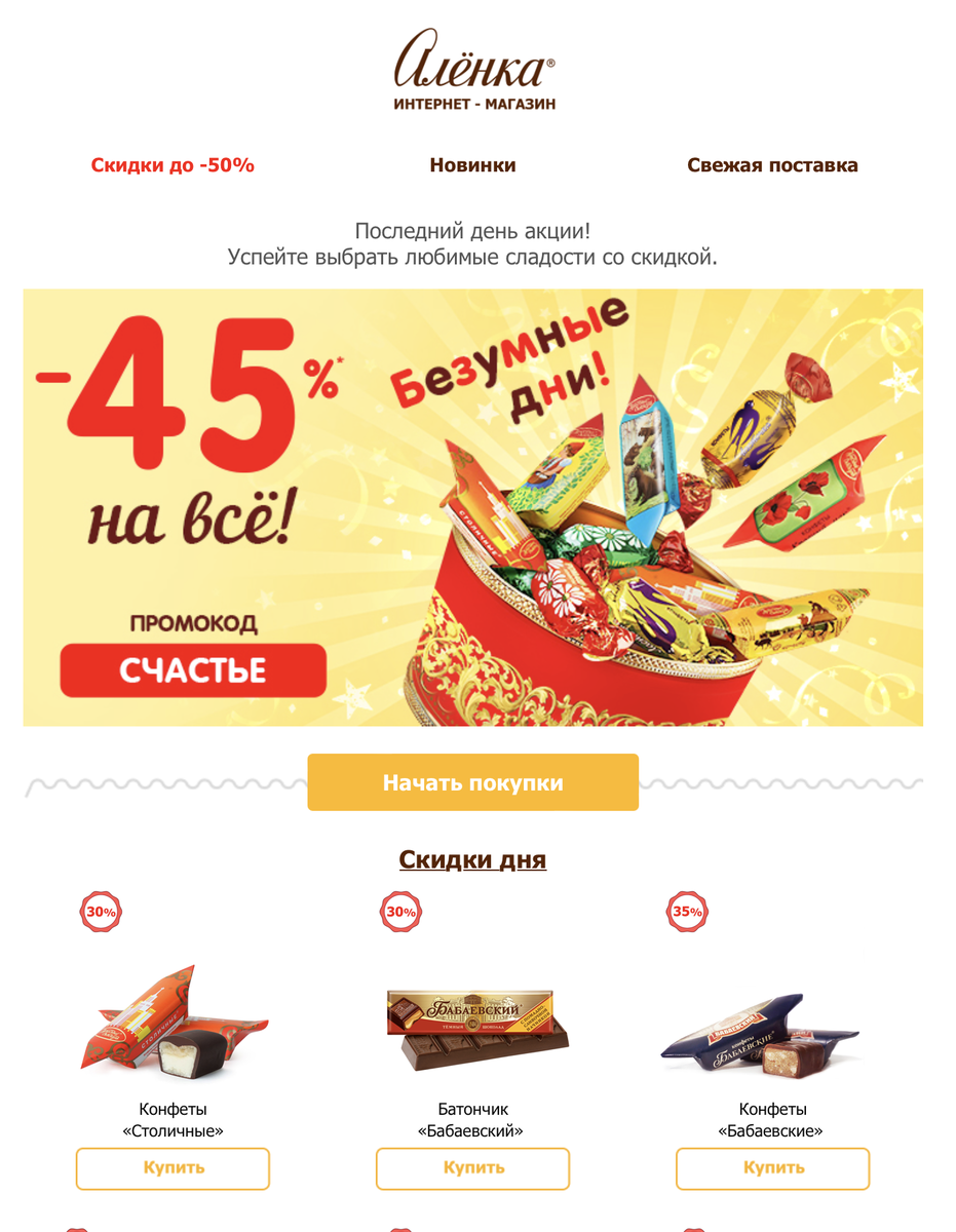 Кто из нас не любит сладости? Сладости любят все! От мала до велика, дети и взрослые, худенькие и не только. На этой неделе своей скидкой нас одаривает магазин "Аленка". Тот самый магазин, вкусняшки которого мы все любим с детства. У магазина, который находится в Москве и до которого не каждый доедет, есть свой интернет-магазин https://clck.ru/356y5r . Что нам надо сделать? Все просто: И главное - в графе ПРОМОКОД пишем слово "СЧАСТЬЕ". Здесь получается две выгоды: скидка 45% и бесплатная доставка. Что мне нравится в этом магазине, так это объединение всех знакомых мне брендов конфет, всегда свежий товар и просто огромный ассортимент. Покупайте вкусняшки и окунитесь вместе с ними в детство!