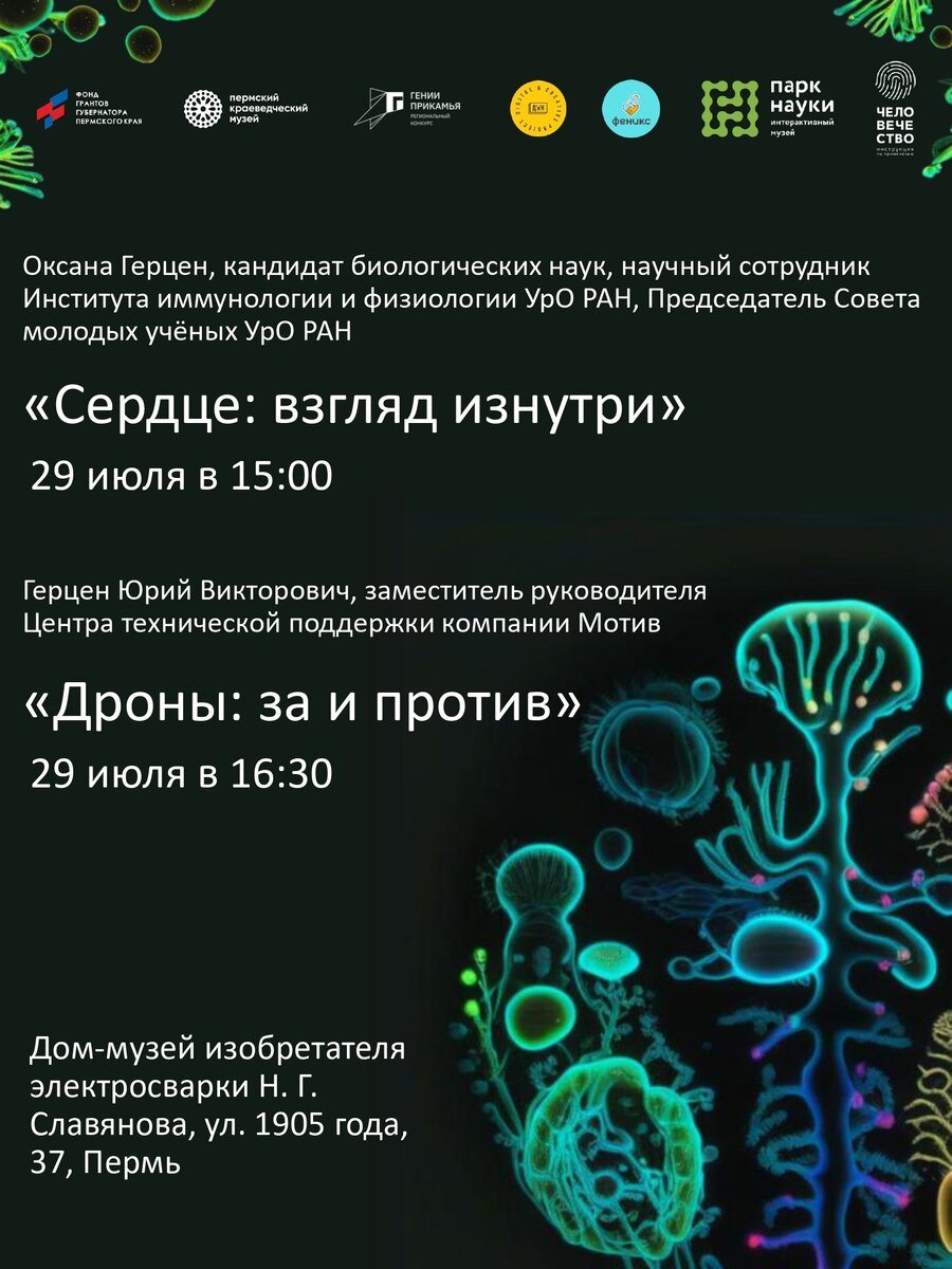 В субботу, 29 июля, приглашаем в музей сразу на две лекции. В 15:00 вы сможете узнать о работе сердца от кандидата биологических наук Оксаны Герцен на лекции «Сердце: взгляд изнутри».