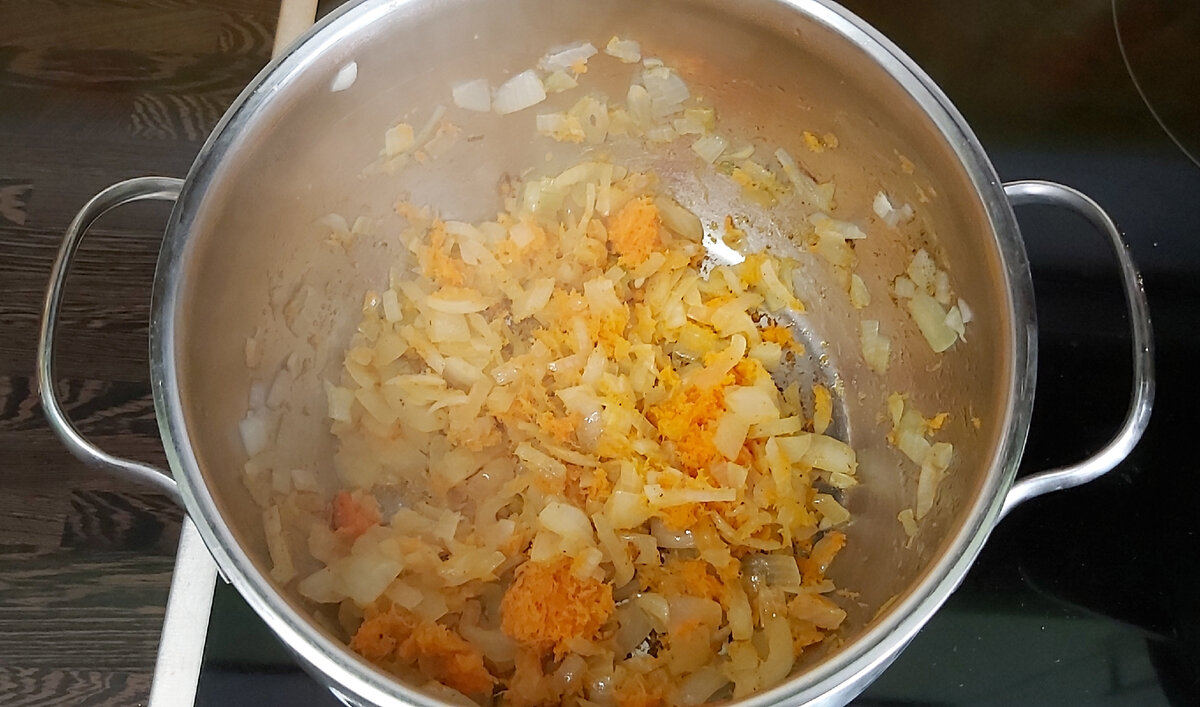 1. Лук очистить, помыть, нарезать и отправить обжариваться в небольшом количестве растительного масла в кастрюлю, в которой будем варить суп.