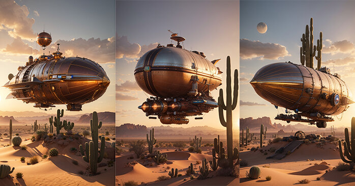 Что касается точного соответствия запросу, то здесь сложнее. Стимпанк-дирижабль почему-то превратился в воздушный шар, кактусы плохо поддаются исчислению, молодой месяц ― то один, то ни одного, а то с друзьями. При этом большой разницы между включённым и отключённым Expanded Domain я не вижу: в целом запрос снова выполнен довольно точно, а несоответствия по мелочам (в части наличия месяца на небе и количества кактусов) равномерно присутствуют и там, и там.