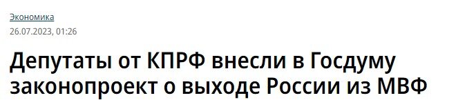 Депутаты от КПРФ внесли в Госдуму законопроект, предполагающий денонсацию всех документов, по которым Россия вступала в МВФ, а также Международный Банк Развития и Реконструкции (МБРР) и Международную Ассоциацию Развития (МАР).