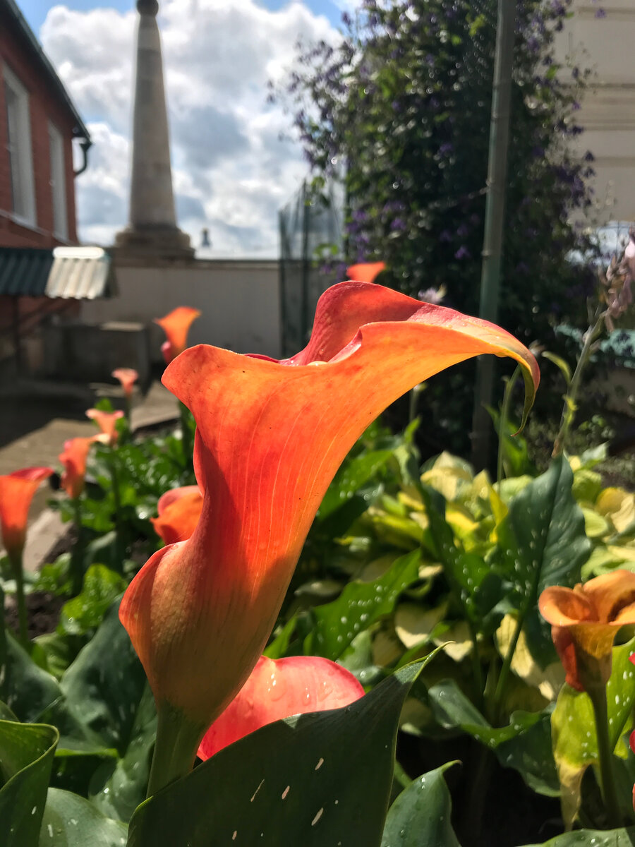 вчерашнего рассказа. В монастыре я успела сделать ещё один маленький рисунок - увлеклась с коллегами разглядыванием обильных цветов, села у входных ворот с сохранившимися иглоподобными "египетскими" стелами. Вид на город оттуда - сказочный. По-настоящему. Огромное небо с билибинскими облаками, холмы, маковки храмов, река блестит. Райские преддверия, да и только. А на первом плане - каллы, невероятного насыщенного тона, форм почти анималистических. За эту вот "животную", почти движущуюся структуру я люблю и ирисы. Моя версия этого монастырского уголка - слева. А центральный разворот - вид на Введенский храм, с кусочком влезшего собора на главной площади. Вот студенты начали его писать: Храм выразительный и сейчас, даром что перенёс варварскую самодеятельную реставрацию в начале двадцатого века - исчезли стилистические признаки милого провинциального барокко; ну что ж, зато крыша есть, сохранны основные объёмы. Храм для меня особенный - связан с именем Розанова, моей отч
