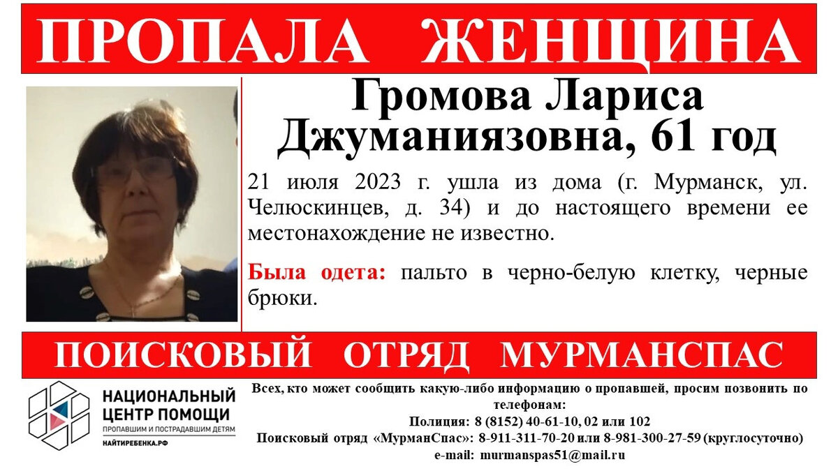 Мурманчане ведут поиск 61-летней Ларисы Громовой. 21 июля она ушла из дома на улице Челюскинцев, 34 и с той поры не подавала о себе вестей.