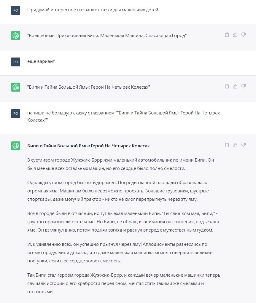 Хотите зарабатывать в интернете сидя дома, но не знаете как ? Не хотите показывать своего лица в своих видео? Не хотите сами озвучивать Ваши видео? Не хотите придумывать сюжет ? Ну либо ни чего не умеете ? Нейросеть поможет легко зарабатывать в интернете сидя дома, без особых усилий и каких-то глобальных знаний. А главное - это абсолютно бесплатный способ заработка в интернете! Сейчас расскажем как Что нам понадобится: Схема работы по пунктам выше: 1)Придумываем идею для нашего видео в нашем примере это будет сказка/рассказ для детей. Заходим на сайт и выполняем не хитрые действия. Сначала попросим нейросеть придумать интересное название и далее написать не большой рассказ на эту тему ( Фантазии безграничны можете сочинять контент и для более взрослой аудитории). Вот что у нас вышло : 2) Начинаем поиск картинок, открываем сайты из пункта два и по ключевым словам из рассказа генерируем или подбираем картинки. Тут опять же все зависит от ваших фантазий. Вот например наша маленькая машинк