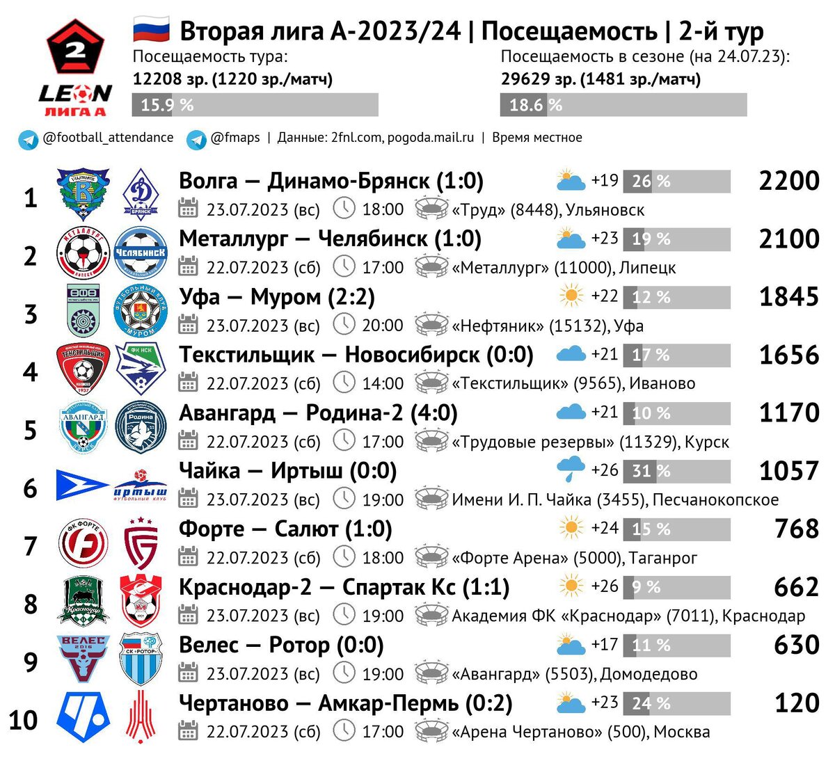 Самым посещаемым матчем стала игра в Ульяновске (2200). Статистика и инфографика ниже. Эти и многие другие цифры о футбольной посещаемости вы можете увидеть в Телеграм-канале «Футбольная посещаемость». Подписывайтесь, чтобы не пропустить обновлений! Посещаемость тура Посещаемость матчей Заполняемость стадионов
