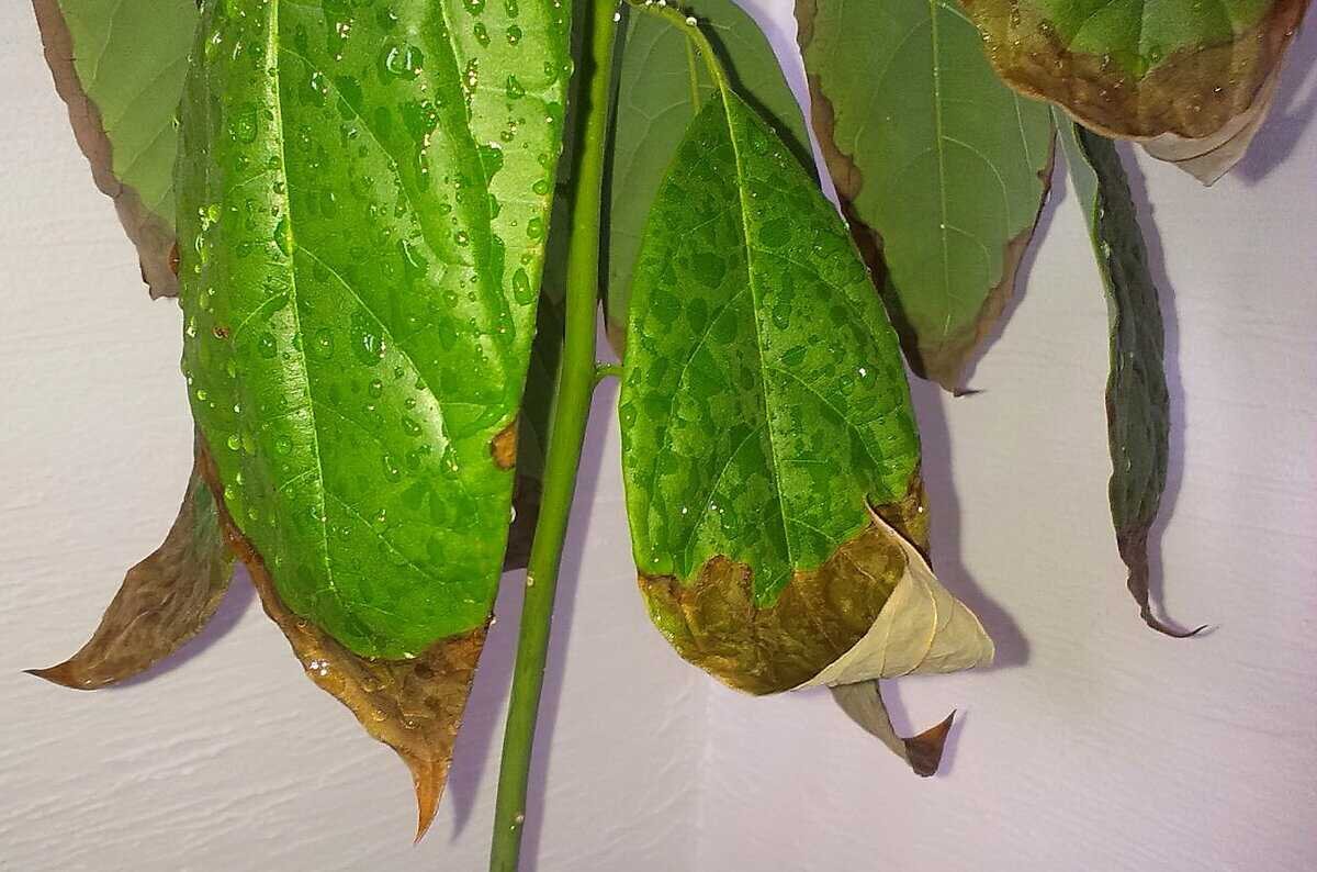 В комнатных условиях при повышенной сухости воздуха практически все растения могут подвергаться атакам паутинного клеща. Если у авокадо сохнут кончики листьев и на них появляется сначала еле заметная крапчатость, то первым делом необходимо проверить их обратную сторону с помощью увеличительного стекла на предмет наличия мелких черных точек.