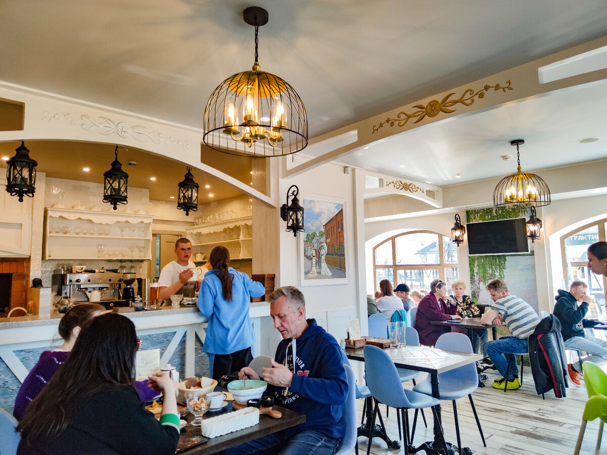 И вот на всё это безумное количество туристов в Плёсе есть всего с десяток заведений общепита. Уберём отсюда несколько кофеен и пекарен, где полноценно поесть не выйдет, и получим совсем уж маленькое количество — не более 5 в центре города, ещё парочка чуть поодаль.
