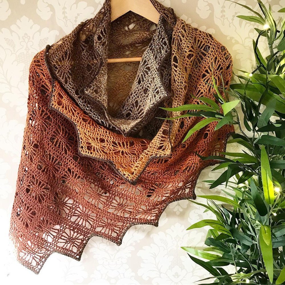 Здравствуйте, друзья и гости канала! Сегодня, пролистывая Pinterest, попалось на глаза красивое фото палантина с приятным градиентом. Работа зарубежного автора, фото взяты здесь. Понятно, что палантин связан крючком популярным узором "паучки". Меня заинтересовали края, они неровные. Судя по фото, палантин вяжется по диагонали. Это видно по столбикам. Есть точная схема этого узора. Итак, как я думаю связан палантин. Начать с 2-х "паучков", прям по схеме связать. Затем необходимо расширить по одному "паучку" с обоих сторон. Закончили 6-й ряд (по схеме) и набрали цепочку из 15 петель (один "паучок" 12 петель + 3 петли подъема, вместо столбика с накидом), с 5-й петли от крючка начинаем вязать ряд столбиками с накидом и так до конца ряда (7 ряд на схеме), затем так же в конце ряда набираем цепочку из 15 петель и провязываем еще один ряд столбиков. На фото видно, что между "паучками" 2 ряда столбиков с накидом. Цифрами показала ряды "паучков". 1-й ряд из двух "паучков" на фото не видно