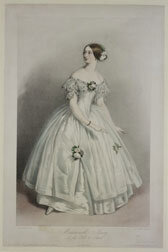 В 1850-х годах женские юбки были куполообразными и имели форму колокола, поддерживаемые нижними юбками с кринолином.Они часто украшались глубокими воланами или ярусами.Были популярны длинные шаровары и панталоны, отделанные кружевом.В моде были многоярусные жакеты-накидки, а также шали с рисунком пейсли.Носили глубокие шляпки, а волосы зачесывали в пучки или боковые кольца с пробором посередине.
