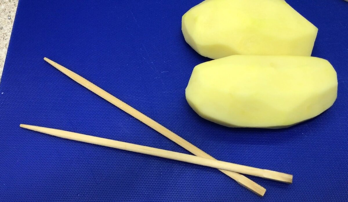 Чтобы не отрезать пластины картофеля до конца подкладываю вдоль клубня под лезвие ножа палочки для суши.