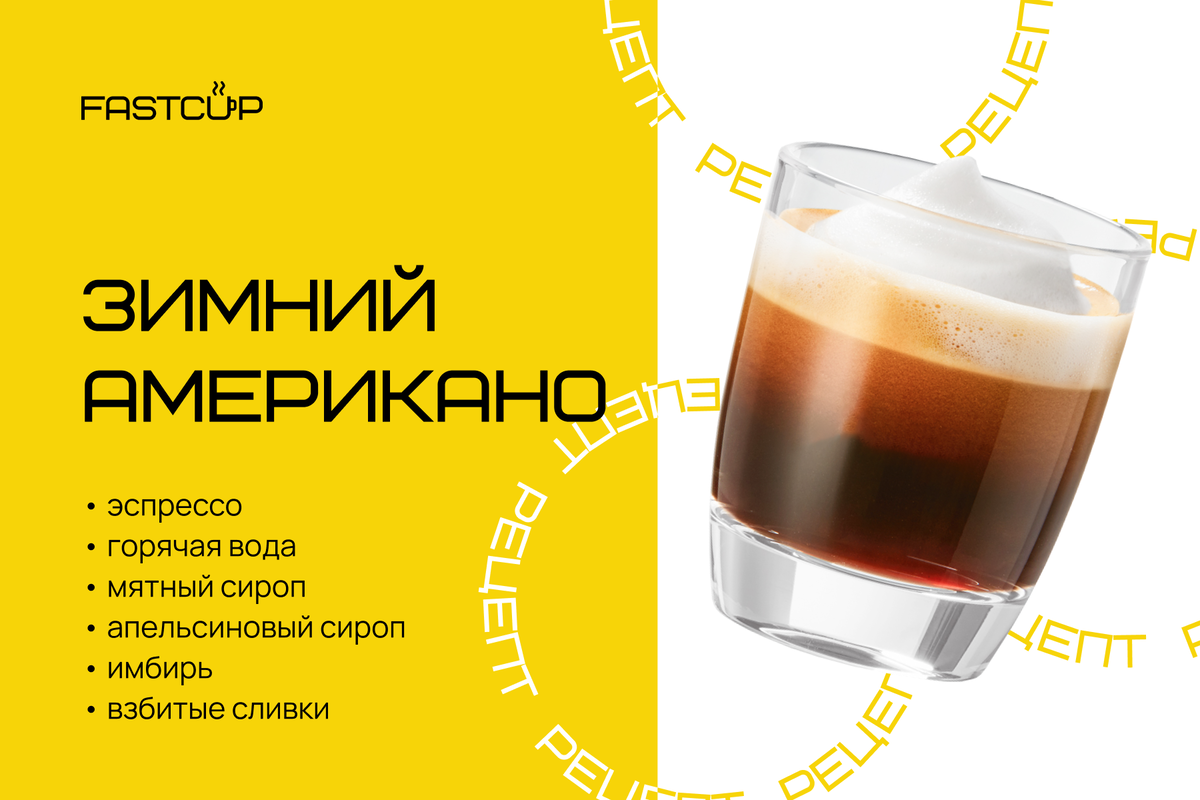 Кофе для быстрого города – FASTCUP! Познакомим вас поближе с нашим вкусным меню. Зима уже потихоньку подходит к концу и на смену ей скоро придут тёплые и солнечные деньки. Однако ароматный “Зимний американо” ещё вас ждёт. Раскроем для вас тайну его приготовления. Рецепт: • эспрессо; • горячая вода; • мятный сироп; • апельсиновый сироп; • имбирь; • взбитые сливки. В итоге получается приятный лёгкий напиток для целеустремлённых и практичных людей.