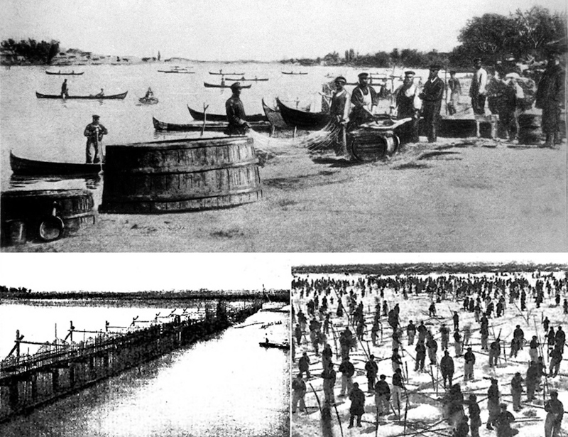 Но вплоть до ХХ века город по-прежнему жил рыбой, в узком Яике столь многочисленной, что порой её массы ломали бревенчатые учуги. На кадре выше три вида местного лова: осеняя "плавня", когда к рыбным заводям-"ятовям" устремлялись целые флотилии со своими атаманами; весенний учуг (после 1750-х годов оставшийся только в Уральске), задерживавший рыбу в нерест, и зимнее "багрение" на тех же ятовях, где рыба подо льдом ждала весны.