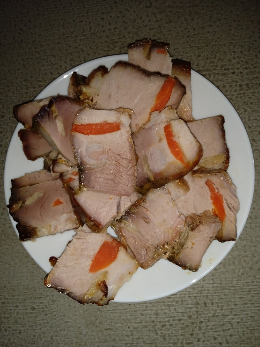 Если вы собираетесь готовить буженину к определённому дню, то лучше сделать это заранее. От замаринованного мяса до готового блюда нужно около двух дней. Для приготовления буженины вам понадобится: кусок свинины около 3 кг., морковь 1 шт.( можно готовить без моркови), чеснок 1 головка, соль столовая ложка с горкой, перец чёрный молотый, мёд и горчица по 50 гр. Другие специи по вкусу и желанию. Морковь и чеснок почистить, нарезать длинными кусочками, как на фото. Нашпиговать мясо чесноком и морковью. Посолить и поперчить мясо. Равномерно распределить соль и специи по мясу со всех сторон. Накрыть плёнкой и оставить мариноваться на 12 часов. Я готовлю в пакете для запекания, но можно готовить в фольге. Запекать в духовке два часа при температуре 180 - 200 градусов. Приготовить горчично- медовую смесь. Горчицы и мёда должно быть примерно поровну. Тщательно перемешать. Достать мясо из духовки, освободить верхнюю часть от плёнки или фольги. Обильно смазать горчично- медовой смесью. За