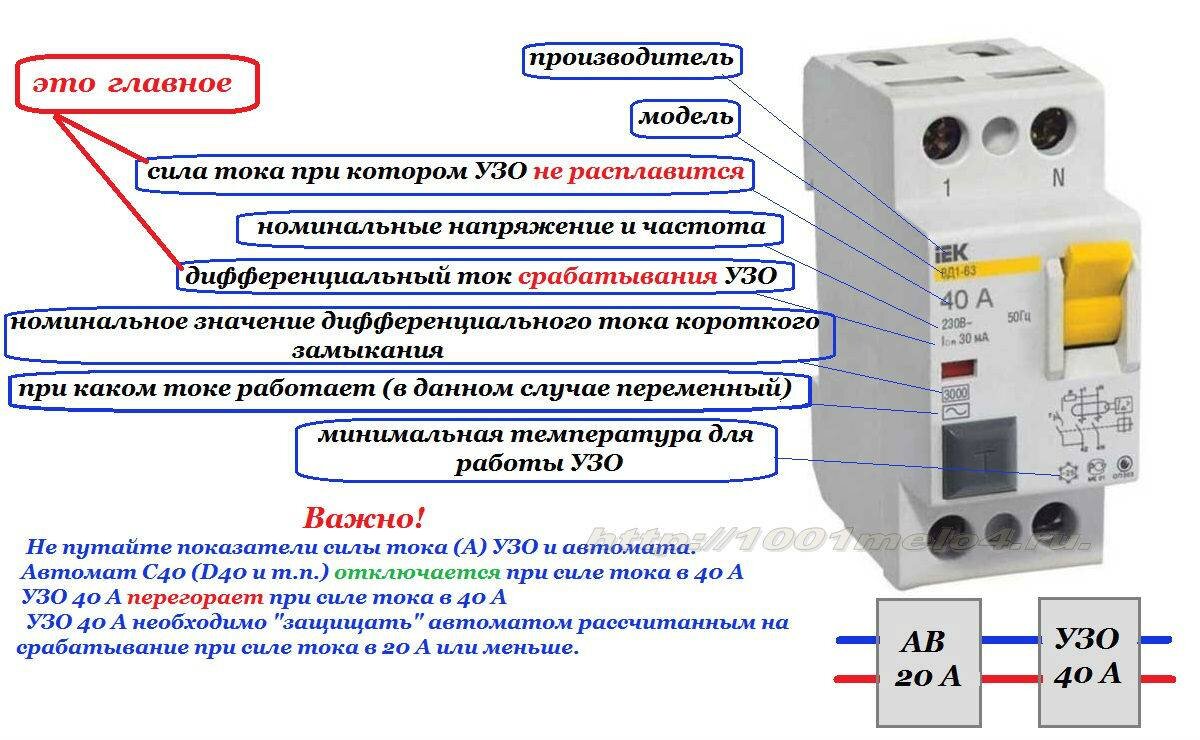 Принцип работы УЗО основан на сравнении тока в нулевом и фазном проводах. При условии исправной изоляции между токоведущими частями электроприбора и заземлённым корпусом эти токи равны. При нарушении изоляции или прикосновении человека к частям, находящимся под напряжением, появляется ток утечки, равенство нарушается и аппарат отключает приборы и провода от сети. Другое название этого защитного устройства - дифференциальное реле или дифреле.