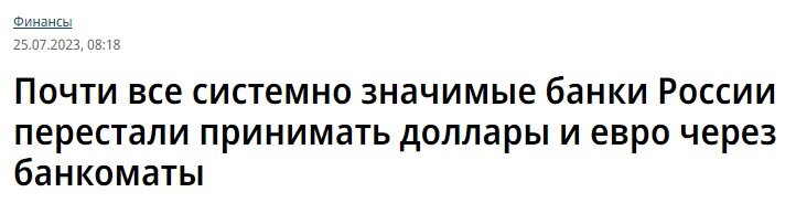 В последнее время зачастили новости о том, что крупные российские банки перестают принимать наличные доллары и евро через банкоматы. На данный момент их не принимают банкоматы 11 из 13 системно-значимых банков России. Вот перечень крупных банков, банкоматы которых их уже не принимают. Надо отметить, что многие прекратили прием еще давно, в 2022 году, некоторые - с начала этого года. Среди банков, отнесенных к системно-значимым, прием валюты через банкоматы пока возможен только в Альфа-Банке и банке Тинькофф, причем Тинькофф берет за это комиссию 5% от суммы. При этом через кассы все эти банки валюту принимают. Но примечательно то, что прием наличной валюты прекращают и банки, не попавшие под санкции, с незаблокированными коррсчетами. Например, недавно о таком решении объявил Райффайзенбанк, причем он с 1 августа прекращает прием наличных долларов и евро даже через кассу. Российская газета (официальное правительственное СМИ) пишет о том, что евро и доллары становятся все более "токсичн