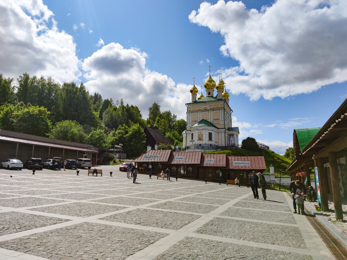 Ну что, друзья, устали, наверное, читать про проблемы Плёса? Мои статьи о переполненных ресторанах, высоких ценах на жильё, толпах туристов и небольшой запущенности могли вызвать у вас логичный вопрос: а зачем вообще туда ехать? Что там такого в этом Плёсе? Почему бы не поехать в менее раскрученные приволжские городки? Давайте я в паре статей расскажу вам о достопримечательностях Плёса. И начнём мы с прогулки по набережной Волги. В самом центре города находится Торговая площадь, с неё мы и начнём. На площади находятся старинные торговые ряды (середина XIX века). Отрадно видеть, что и сейчас помещения используются по прямому назначению — в них расположены сувенирные магазины. Больше всего, конечно же, лавок с ивановским трикотажем. Здесь же находится один из крупнейших храмов города — Воскресенская церковь. Построена в 1810—1817 годах на месте деревянной церкви XVII века. Если спуститься с площади непосредственно к реке, мы попадём к памятнику Шаляпину. Великий певец имел рядом с Плёсом