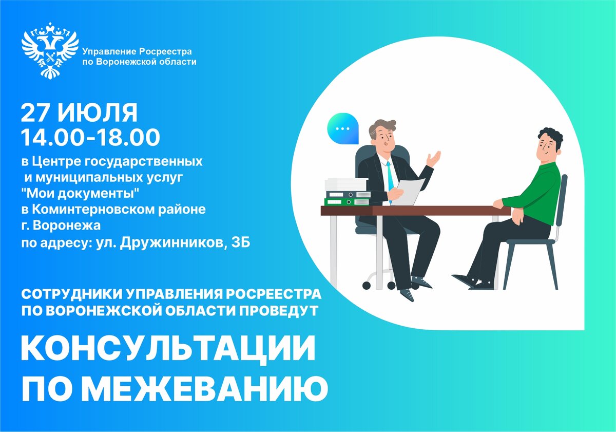 В четверг, 27 июля, в Центре государственных и муниципальных услуг «Мои документы» в Коминтерновском районе г. Воронежа по адресу: ул. Дружинников, 3б состоится консультация по вопросам межевания. Специалисты Управления Росреестра по Воронежской области ответят на вопросы граждан с 14.00 до 18.00. Также напомним, что сотрудники Управления каждый четверг проводят очное консультирование по услугам Росреестра по следующему графику: