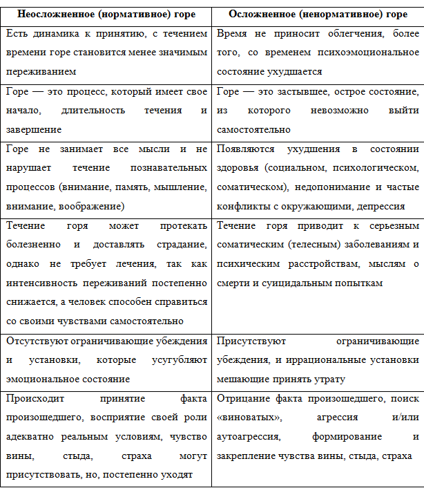 Неосложненное (нормативное) горе протекает плавно, оно проявляется в умеренных переживаниях человека: плаче, тоске, грусти, апатии, злости. Нормальное горе может «уходить» и снова «накатывать», особенно вечерами, когда человек не занят бытовыми делами и не отвлечен работой. В такие периоды наши мысли становятся актуальными, мы их лучше слышим в своем сознании. Однако, с каждым разом такое «накатывание» горя становится все менее интенсивным, все больше наступает принятие произошедшего, после чего наступает смирение.