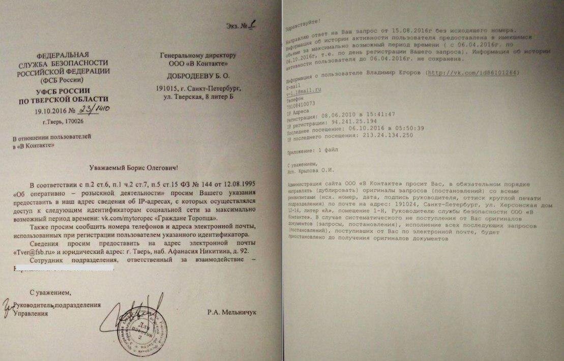 Руководитель во «ВКонтакте» напоминает: «Как Вы знаете, мы уже несколько лет сотрудничаем с ФСБ и отделом МВД, оперативно выдавая информацию о тысячах пользователей нашей сети в виде IP-адресов, номеров мобильных телефонов и другой информации, необходимой для их идентификации». Разумеется, эта специфическая деятельность сервиса, ориентированного на то, чтобы «всегда оставаться в контакте с теми, кто вам дорог», — оправдывается высшими государственными интересами. Электрика из Тверской области Владимира Егорова, условно осудили на два года за критический пост в адрес Владимира Путина в его паблике «Граждане Торопца» по ч. 2 ст. 280 УК РФ (Публичные призывы к эстремизму). vk.com в добровольном порядке сливает данные пользователей ФСБ, после чего те с лёгкой руки заводят на этих пользователей уголовные дела. Большинство уголовных дел, заведённых в России по статьям, связанным с экстремизмом, заведены именно по данным vk.com. Причём сливаются эти данные без решений судов и не по форм