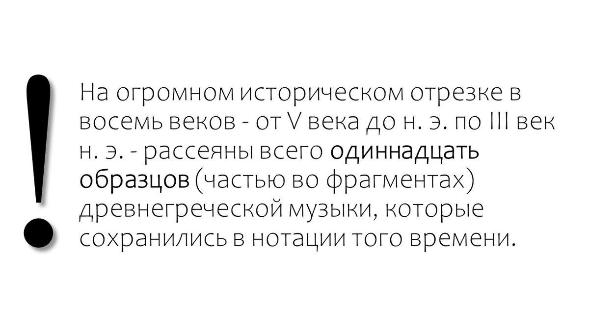 В отличие от других видов искусства музыка античного мира не оставила в истории сколько-нибудь равноценного им творческого наследия. Если памятники скульптуры и архитектуры представляют лучшие достижения античности, а гомеровский эпос, древнегреческая трагедия и создания крупнейших греческих и римских поэтов являются в своем роде классическими образцами античной культуры, то памятники музыкального искусства этого этапа цивилизации поистине бессильны перед ними. Это первые в истории европейской культуры попытки записи мелодий, которые дошли до нас. Но на их основании невозможно воссоздать(хотя бы в минимально) ход развития античного музыкального искусства. Все находки - случайно выхваченные точечные эпизоды этого процесса, тогда как даже общее направление его остается неясным, а последовательность явлений - невосстановимой. Тем не менее некоторые образцы все дошли до сегодняшнего дня. Вместе с обычным текстом на ней были обнаружены знаки древнегреческой нотации. Перевод этих знаков в со