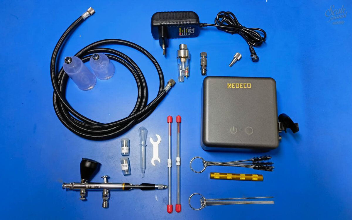 Приветствую читатели моего блога. Сегодня я вам покажу интересный набор от NEOECO, который можно использовать для покраски сборных моделей, ногтей, да и чего угодно в рамках разумного. Набор приезжает в черной коробке и внутри всё надежно упаковано. Содержимое набора после распаковки: Комплект поставки: Ссылки на производителя Официальный сайт - https://neoeco-airbrush.com/ Магазин на алиэкспресс - https://alii.pub/6r0qdr Компрессор Компактное, легкое устройство на прорезиненных ножках. Имеет сенсорное управление двумя кнопками. Левая кнопка отвечает за включение и выключение. Правая за изменение режима. Предусмотрено 3 режима работы компрессора - 16psi, 20psi, 28psi. Что примерно равняется 1,08атм, 1,36атм и 1,9атм соответственно. Субъективно разница в выходном давлении ощущается, измерить реально выдаваемый поток возможности нет. Пробовал на всёх трех режимах грунтовкой от Pacific88 P-13 Черная, дует без проблем. С правой стороны опционально устанавливается держатель для аэрографа.