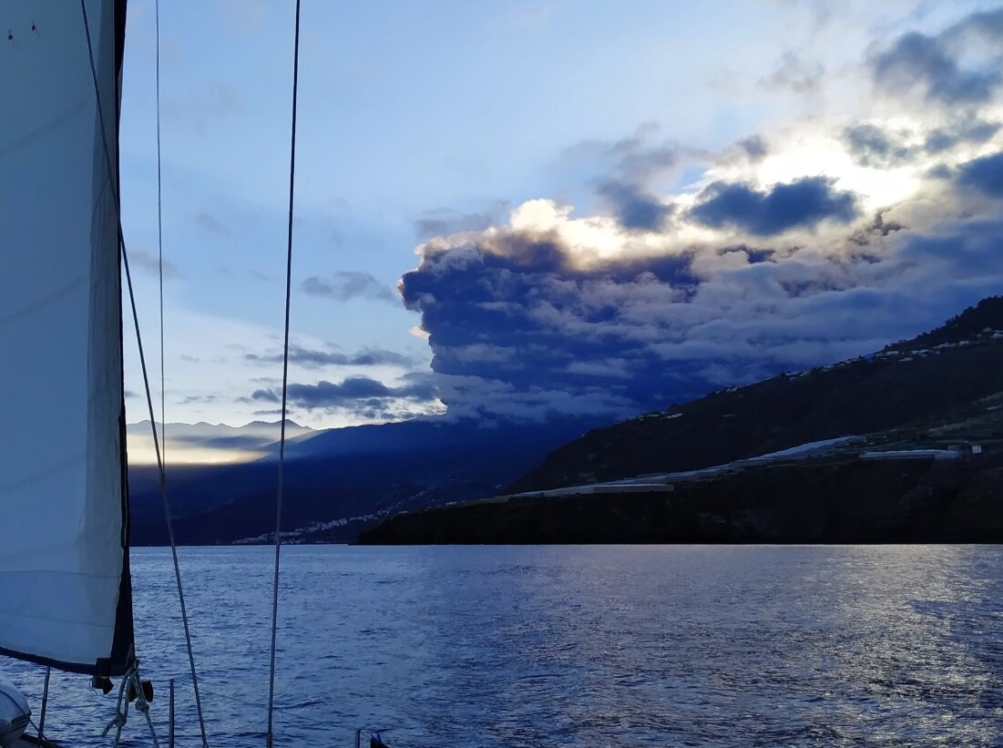 было уничтожено более 3000 строений и эвакуировано 6000 человек. 2021 год. 30 октября 2021. Подходим к Ла Пальме. Практически весь остров засыпан лавой. Пепел везде: на дорогах, на машинах, на растениях. И даже с панамы каждые несколько минут надо стряхивать пепел. Пепел, где это возможно, убирают тракторами и машинами типа снегоуборочных. Часть дорог перекрыта. Подход к вулкану опасен и закрыт. Где больше, где меньше, но пепел во всех частях острова. Восход кажется очень зловещим. Вулкан продолжает извергаться. 01 ноября 2021. Уходим с Ла Пальмы.