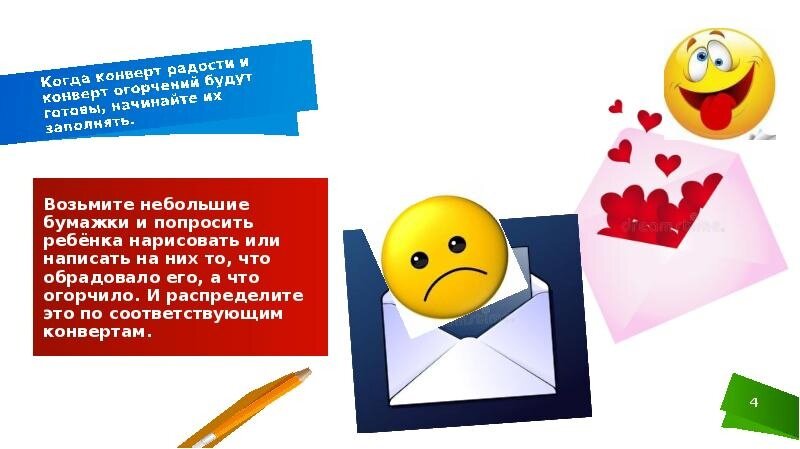 «За целый день успевает произойти масса разных событий – что-то нас веселит, что-то нас удивляет, что-то нас радует, а что-то нас и огорчает. Давай с тобой сделаем конвертики, в которых сможем собирать всё то, что запомнилось за день. В один из них мы будем собирать свои радости, а в другой будем прятать огорчения».