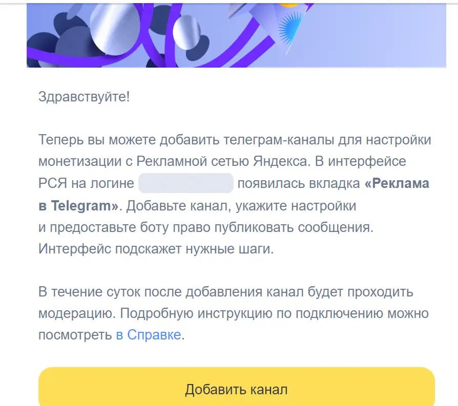 🔹 Не беспокоиться о качестве рекламы благодаря строгой модерации на стороне Яндекса" Так как я владею Телеграм проектом, то сразу же решил оставить заявку. Тем более поиск рекламодателей на самой площадке - большая боль любого админа, об этом позже. Прошло пару дней и мне на почту пришло письмо (см.скрин) После этого нужно было пройти несложную регистрацию своего канала в РСЯ. Для этого понадобилось только лишь добавить бота Яндекса в админы и заполнить пару пунктов, например: время размещения рекламных постов, логин админа и Минимальный CPM. Прождав пару часов модерации, на почту пришло письмо (см.скрин) Через сутк