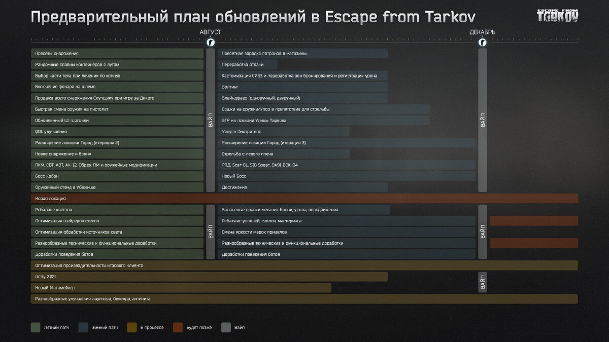 На подкасте: ● Оружие • В небольшом видео были показаны ПКМ, СВТ, АК-12, АВТ, Обрез (Отца Рыжего), обновленный ПМ и его модификации. • ПКМ — будет оружием босса. По всей видимости либо Кабана, либо Трамбона. • В предстоящем августовском патче будут новые обвесы для оружия. • Идёт работа над новой отдачей для оружия. Показали видео с промежуточным результатом, который не является финальным. • В предстоящем патче добавят пресеты полного снаряжения чтобы можно было одеться и пойти в рейд "по 1 клику". • Раскраска оружия запланирована и в разработке. • Сошки ждите не раньше Декабря. • Оружейный стенд в Убежище. Он не только будет удобным, но и полезным. По объему он будет похож на оружейный ящик, что позволит хранить некоторые оружие там, что выиuрает для вас немного место в Схроне. ● Локации • Расширение Улиц Таркова + Новый босс — Кабан. Это не последние расширение Улиц Таркова. • Первая версия Таможни была сделана Никитой (он ставил объекты и т.п.) • Будет улучшение Развязки в виде у