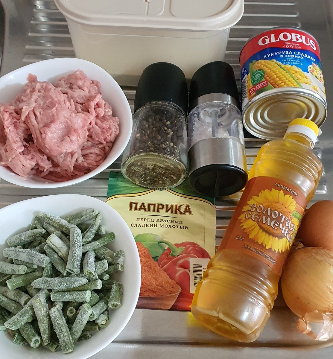 В миске соединить фарш, стручковую фасоль, лук, яйцо и кукурузу.
