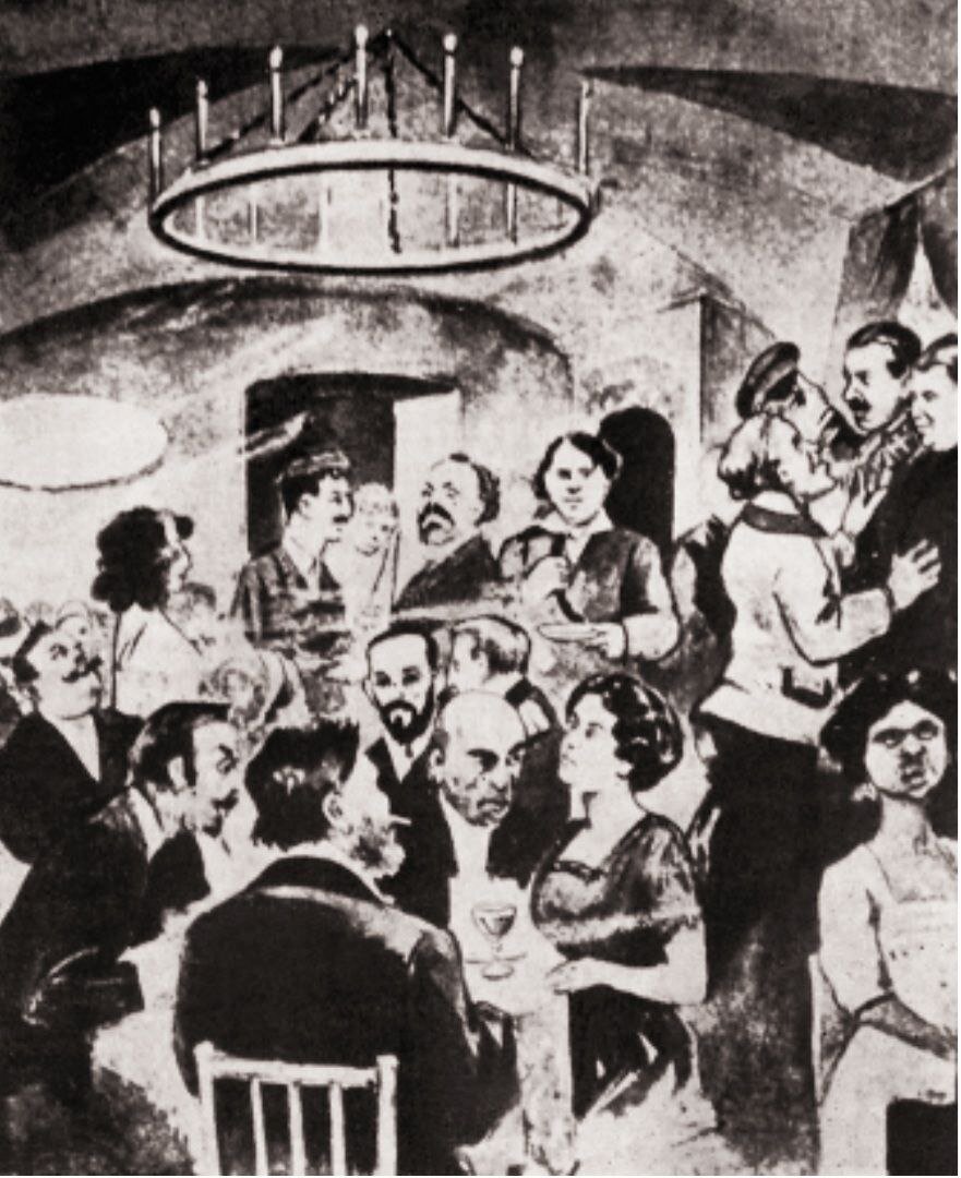 Все мы бражники здесь, блудницы, Как невесело вместе нам! На стенах цветы и птицы Томятся по облакам. Ты куришь черную трубку, Так странен дымок над ней. Я надела узкую юбку, Чтоб казаться еще стройней. Навсегда забиты окошки: Что там, изморозь или гроза? На глаза осторожной кошки Похожи твои глаза. О, как сердце мое тоскует! Не смертного ль часа жду? А та, что сейчас танцует, Непременно будет в аду. А. Ахматова. 1 января 1913 Новый 1913 год Ахматова и Гумилёв встречали в "Бродячей собаке". А 1 января Анна впечатления новогодней ночи выразила в стихотворении, одном из самых её известных. Этот артистический подвальчик просуществовал недолго. Около трёх лет. Но тот всплеск творческой энергии Серебряного века, который здесь не просто случился, он здесь буйствовал, остался в этом месте навсегда. Я бываю в "Бродячей собаке" каждый свой приезд в Питер. Там до сих пор эта энергия жива! Правда-правда! Я не придумываю! Место это уникальное!.. Анна в стихотворении своём (это тольк